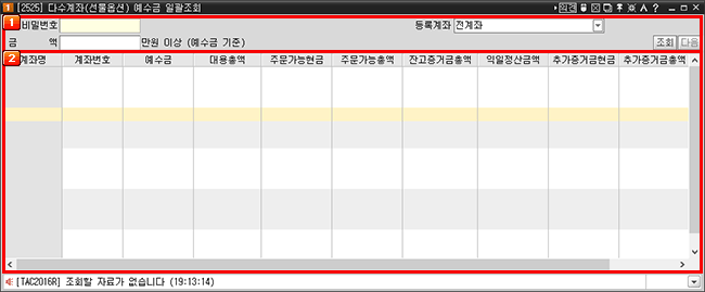 타인명의로 등록된 다수계좌들의 예수금, 증거금 등의 계좌정보를 조회할 수 있는 화면입니다.