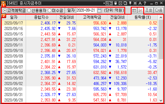 일자별로 종합지수와 증시자금의 추이가 조회됩니다.