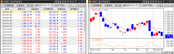 고객예탁금, 신용융자, 미수금에 대한 일자별 추이데이터 및 차트를 확인할 수 있는 화면입니다.