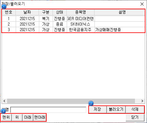 [불러오기] 버튼 : 이전에 저장해둔 가상매매/복기 내역을 불러오기 합니다. 불러오기 후 현재 진행중인 가상매매/복기 내역은 삭제됩니다.