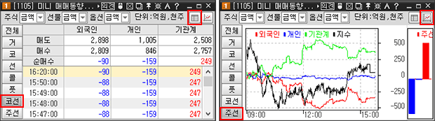 각 버튼을 클릭하시면 시장 전체와 '거래소, 코스닥, 선물' 등의 투자자 매매동향을 조회하실 수 있습니다.