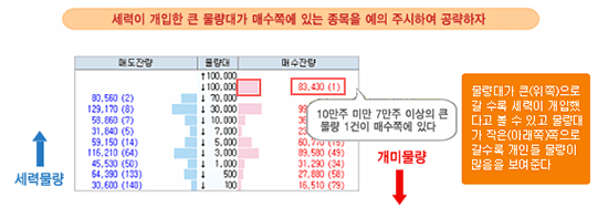 세력이 개입한 큰 물량대가 매수 쪽에 있는지 매도 쪽에 있는지 Visual하게 보여줌으로써 세력의 의도를 파악할 수 있고, 세력이 개입한 종목인지의 여부까지도 파악이 가능합니다.