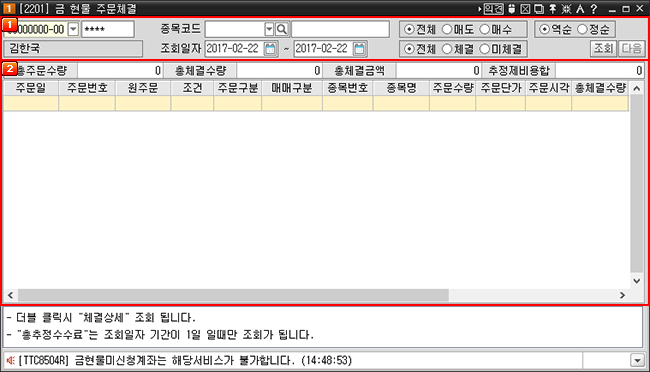 금 현물의 기간별 주문체결 현황을 조회할 수 있는 화면입니다.