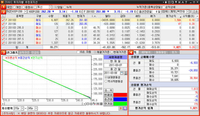손익 : 포지션 구성종목의 순매수 수량과 매매손익을 선물/옵션(매도,매수) 포지션별로 분리하여 제공합니다.포지션 총손익은 실시간 제공합니다