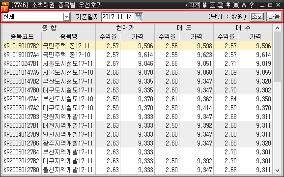 소액채권의 수익률과 매도/매수 우선호가를 조회하는 화면입니다.