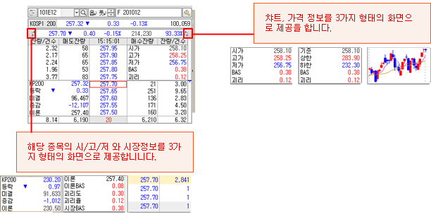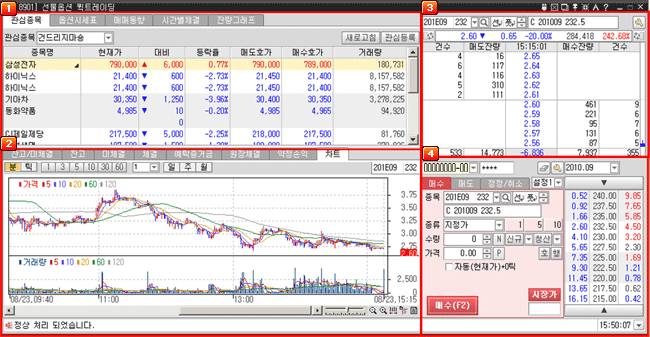 옵션 시세표, 관심종목, 선물옵션 매매동향, 시간별 체결, 잔량그래프 차트가 탭 화면으로 제공되며 각 화면에서 선물옵션 종목을 선택(클릭)하면 호가 및 주문 창으로 해당 종목이 연계됩니다.