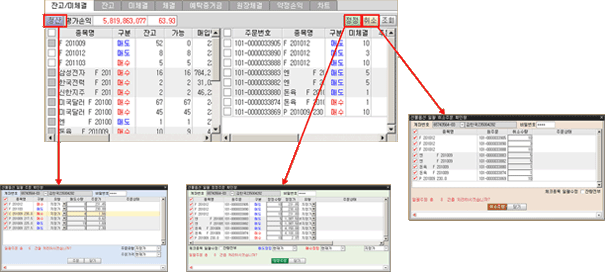 미체결 주문화면에서 선택() 버튼을 클릭하여 전부 선택하거나 마우스로 체크박스에 선택 표시를 한 후 일괄정정() 또는 일괄취소() 주문을 실행할 수 있습니다. 또한 실시간 잔고화면에서 종목을 선택하여 일괄 청산주문을 실행할 수 있습니다. 이 때 청산 주문은 보유 잔고포지션의 반대 주문으로 설정되므로 반드시 확인하셔야 합니다.